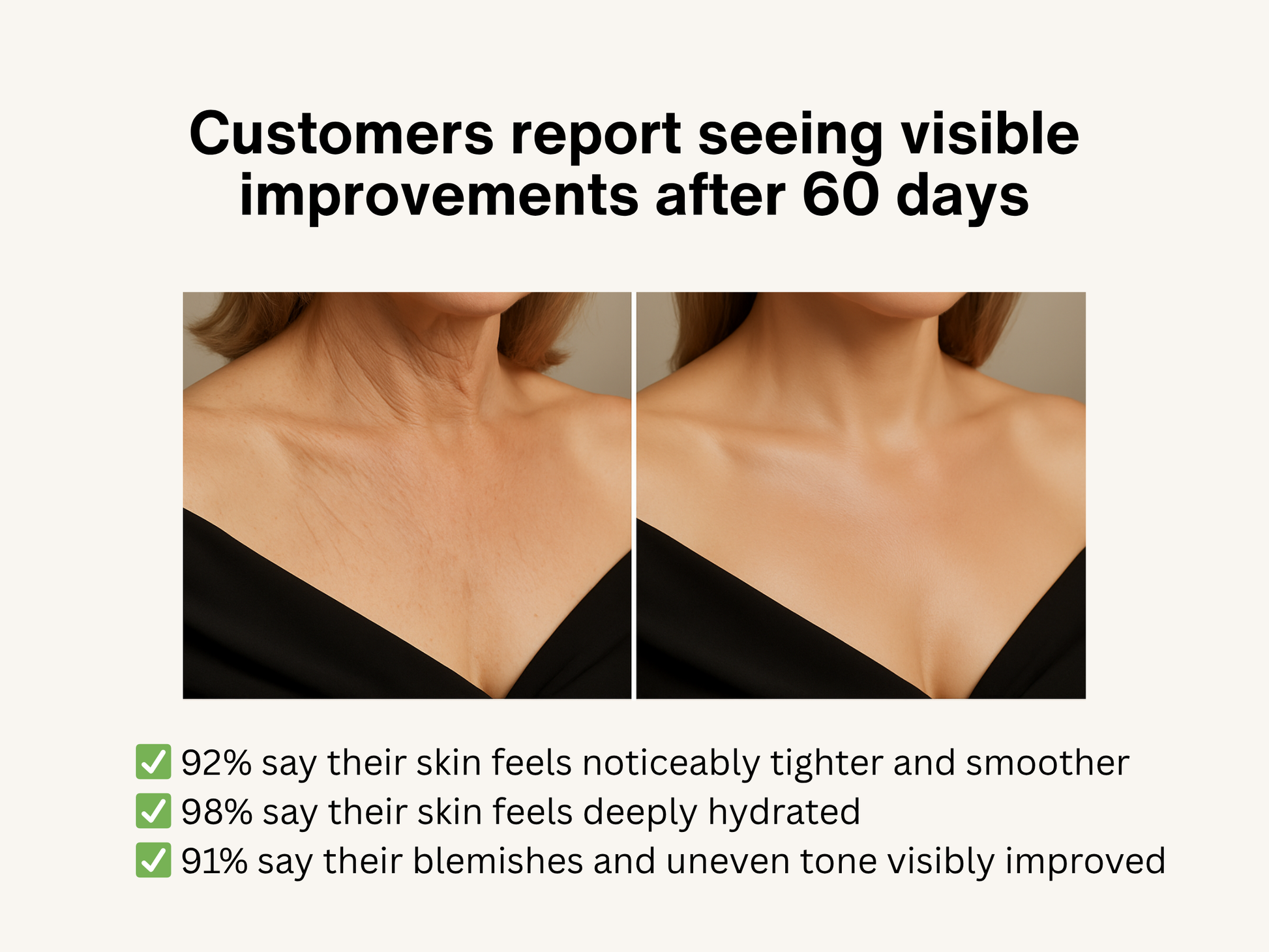Unlike other brands that make wild claims about results within days, we choose honesty with our customers. Every body is different, but most women begin to notice visible changes — smoother texture, more even tone, and renewed softness — within 60 days.