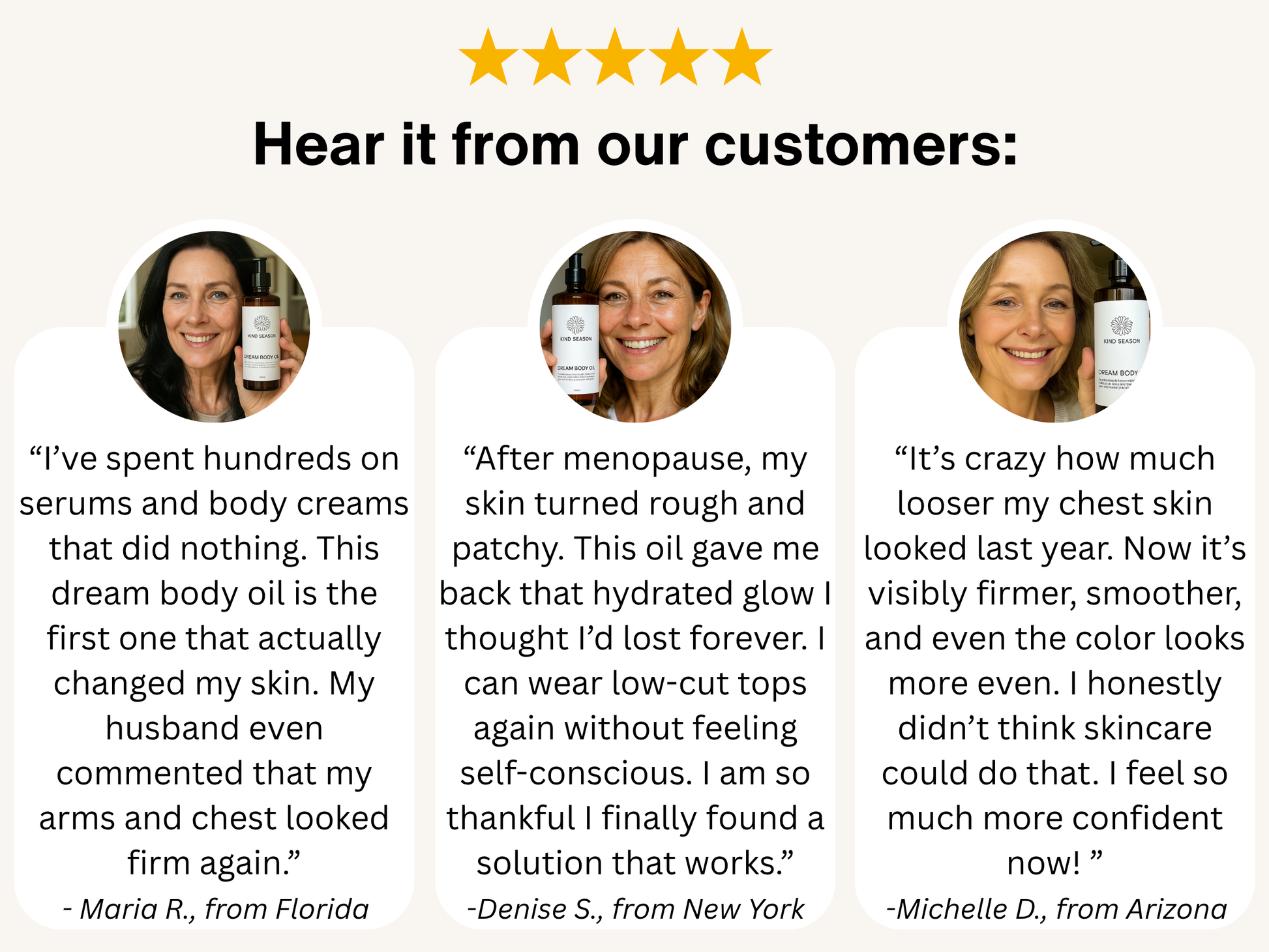“I’ve spent hundreds on serums and body creams that did nothing. This dream body oil is the first one that actually changed my skin. My husband even commented that my arms and chest looked firm again.”