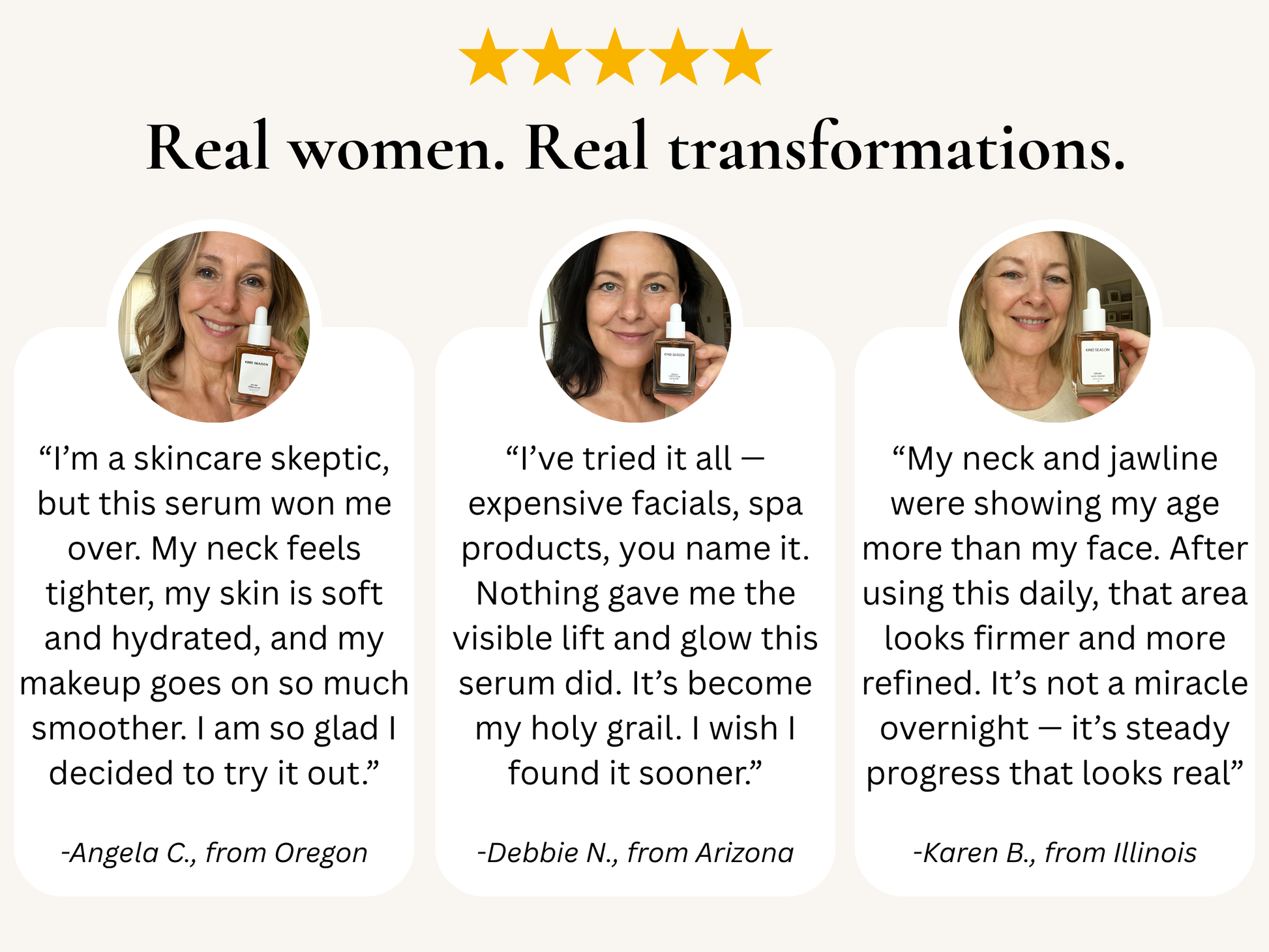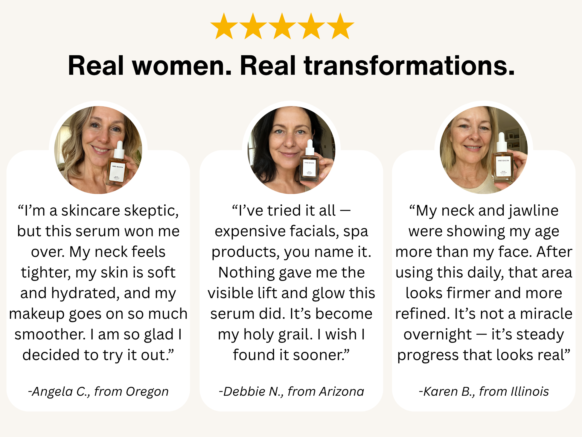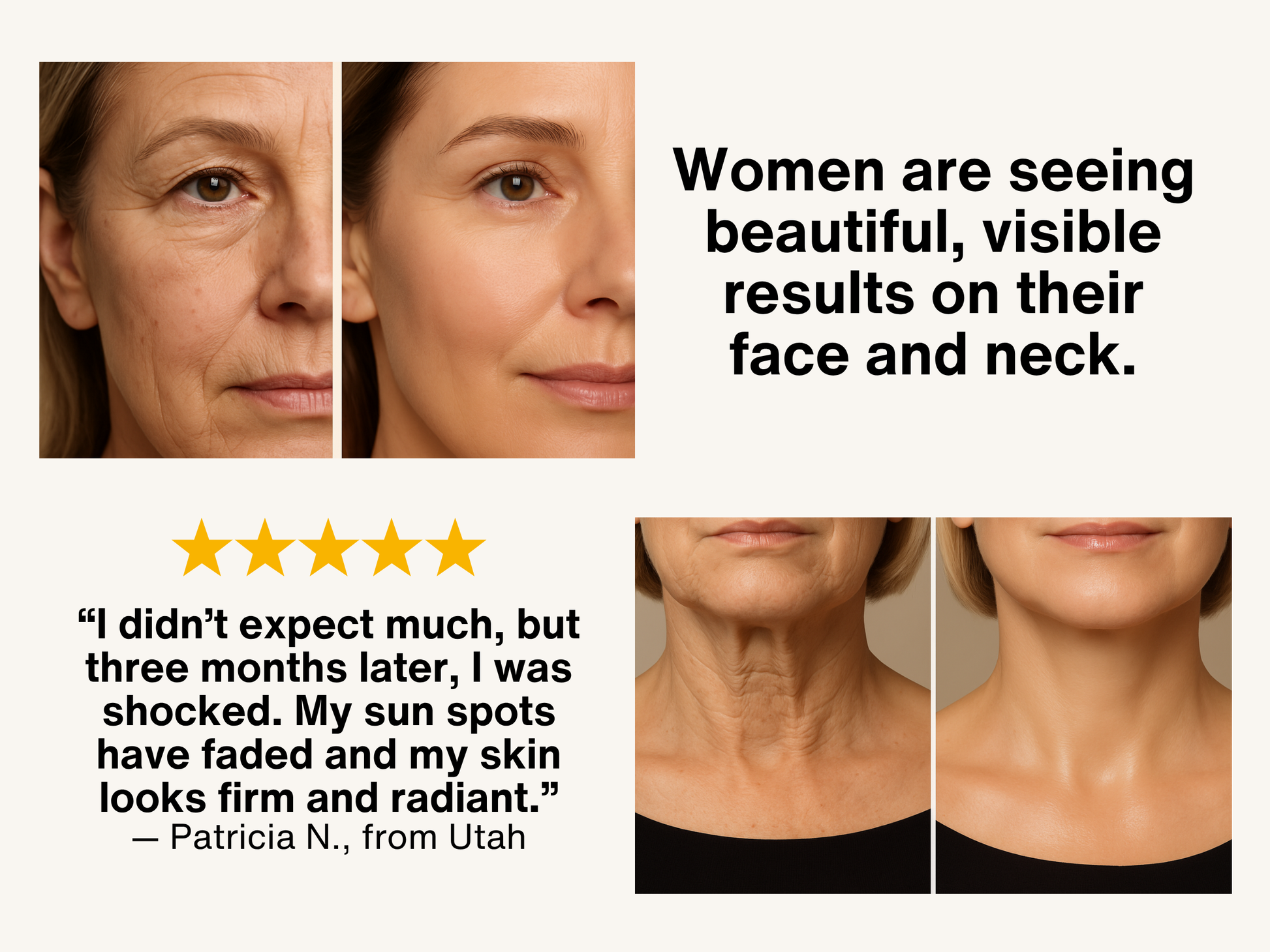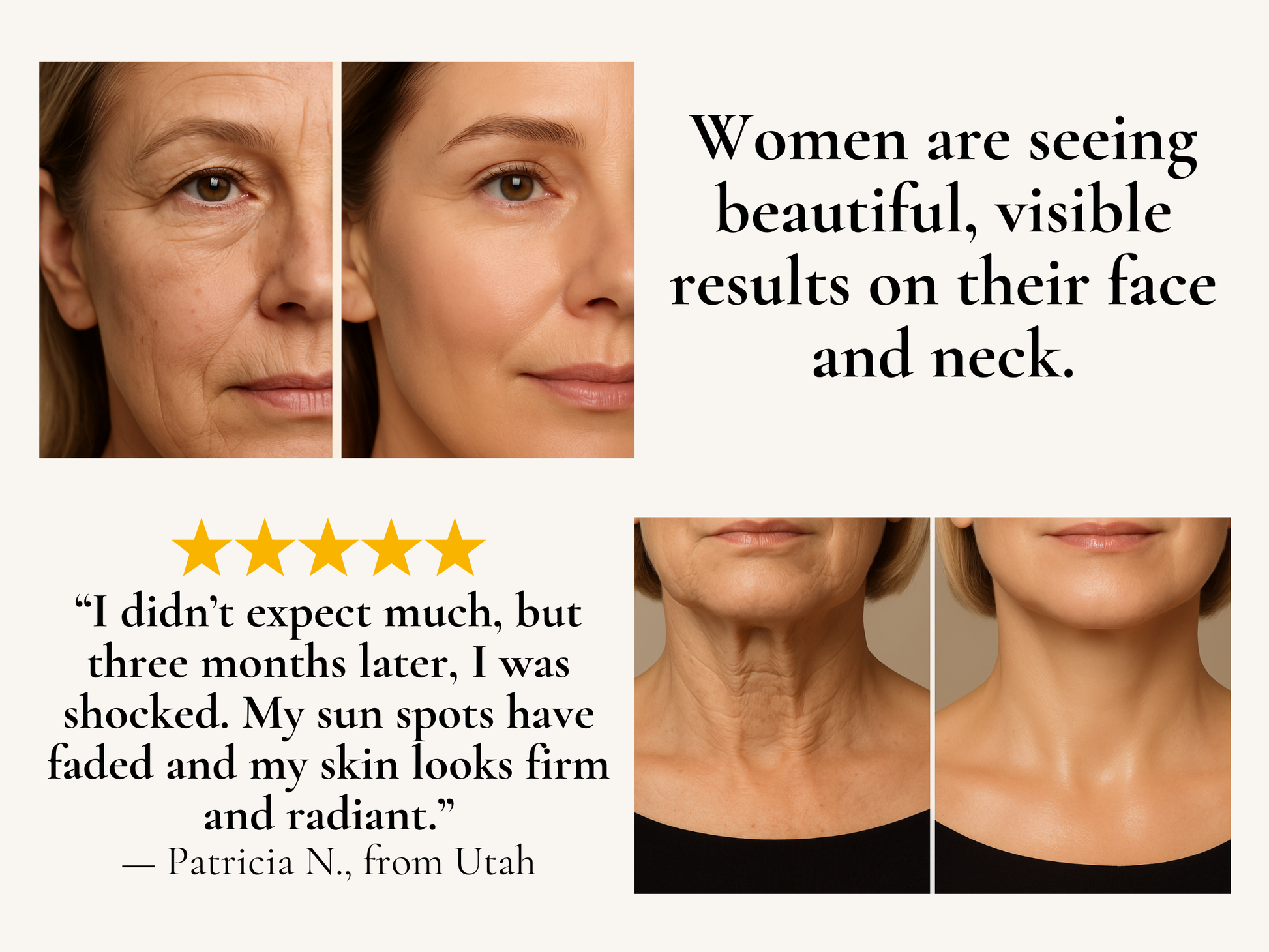 “My neck and jawline were showing my age more than my face. After using this daily, that area looks firmer and more refined. It’s not a miracle overnight — it’s steady progress that looks real”